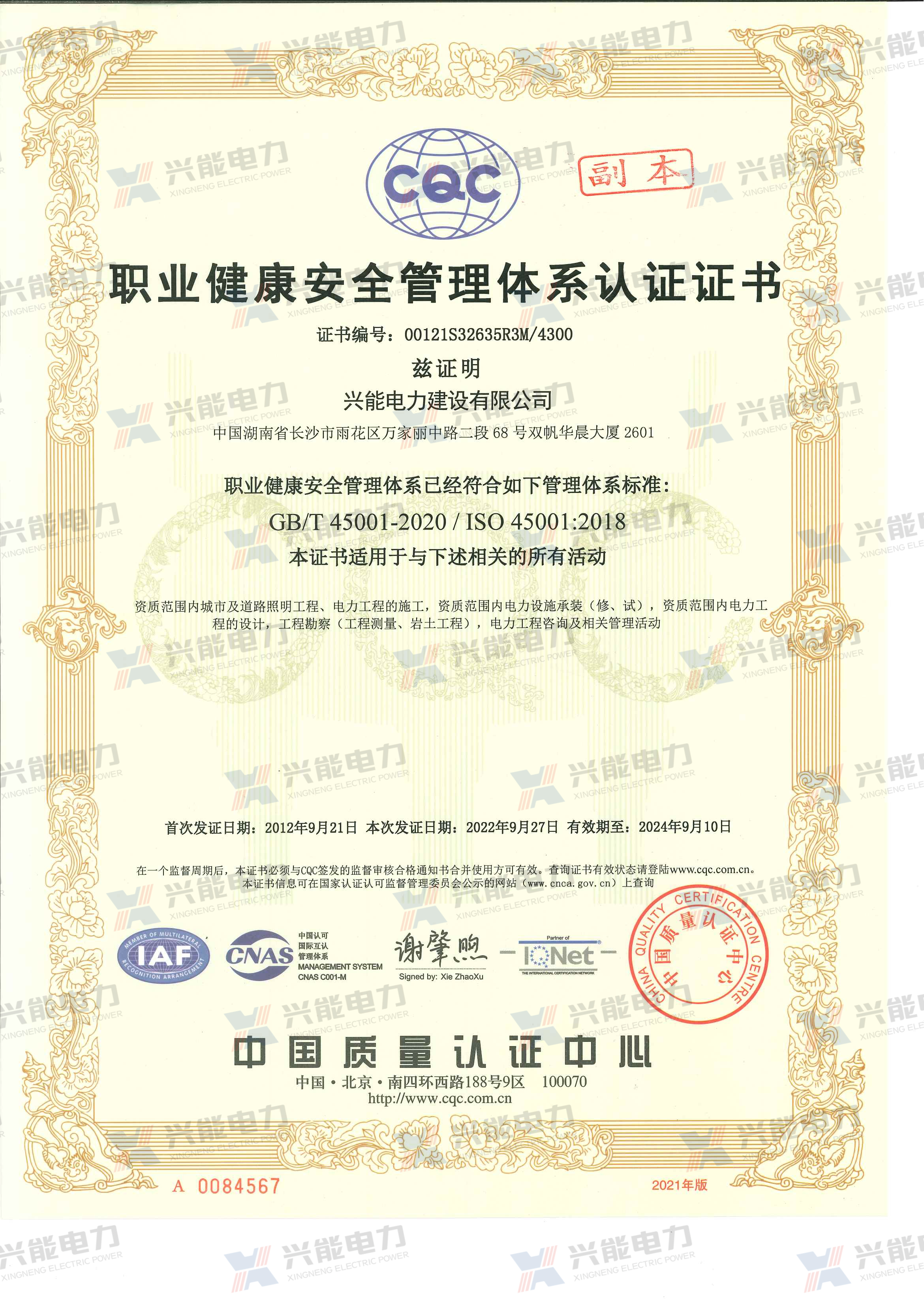 職業(yè)健康安全管理體系認(rèn)證證書