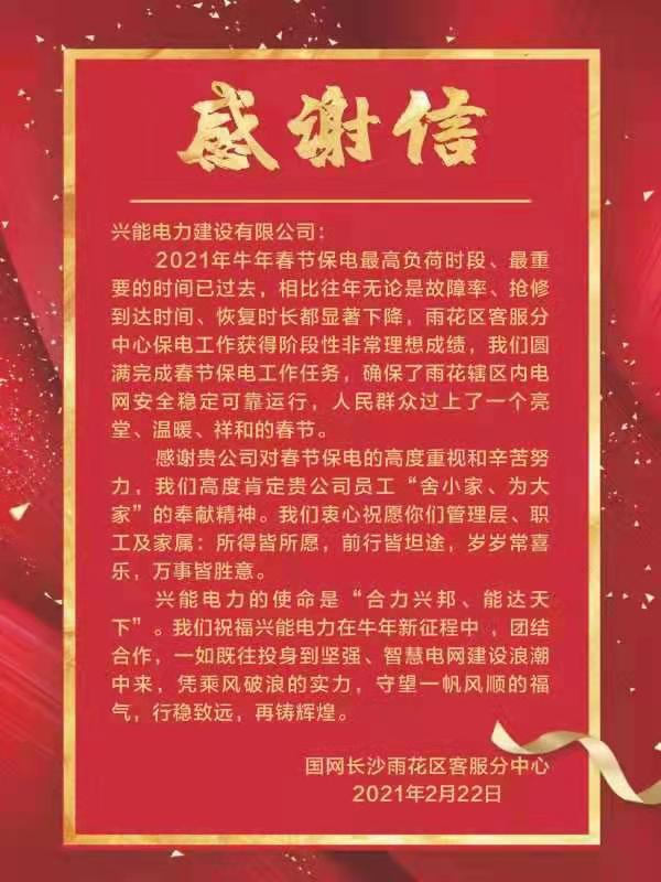 感謝信中指出,2021年牛年春節(jié)保電工作,相比往年無論是故障率、搶修到達時間、恢復時長都顯著下降,保電工作獲得階段性非常理想成績,確保了轄區(qū)電網(wǎng)安全穩(wěn)定可靠運行,人民群眾過上了一個亮堂、溫暖、祥和的春節(jié)。