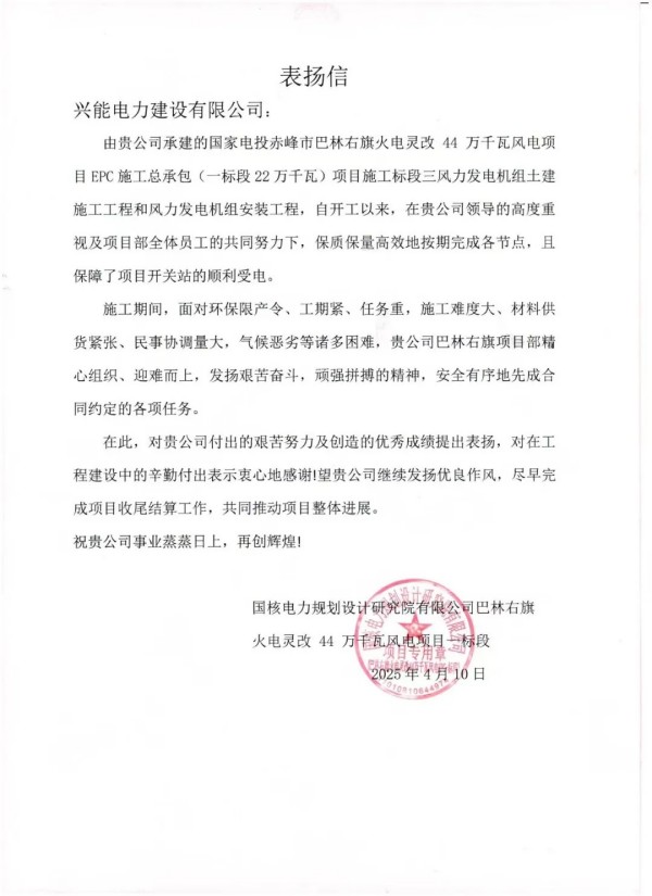 項目完工后,業(yè)主國核電力規(guī)劃設計研究院有限公司對興能電力的工作給予了高度評價,并專門發(fā)來表揚信。信中表示:“在項目建設過程中,貴公司巴林右旗項目部精心組織、迎難而上,發(fā)揚艱苦奮斗,頑強拼搏的精神,安全有序地先成合同約定的各項任務。在此,對貴公司付出的艱苦努力及創(chuàng)造的優(yōu)秀成績提出表揚!”這封表揚信不僅是對興能電力在該項目中工作的認可,更是對公司綜合實力和品牌形象的高度肯定。
