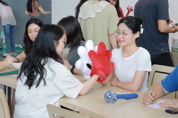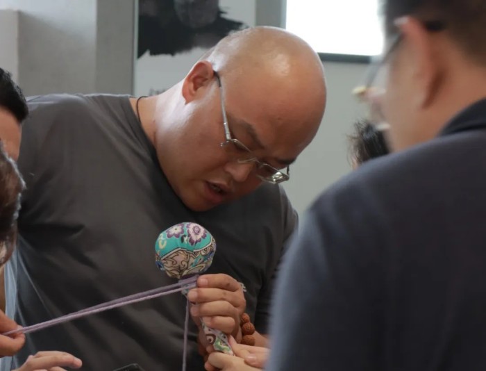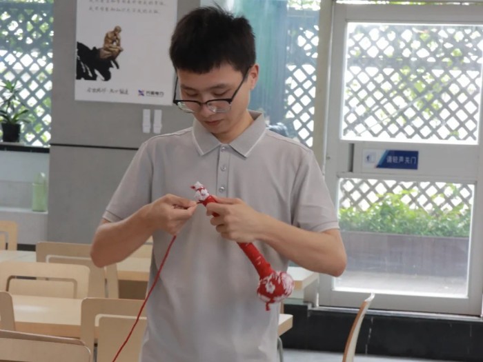 大家細(xì)致填充、耐心捆扎,木錘在掌中初具雛形。新入職的小李興奮地展示自己的作品:“第一次親手做養(yǎng)生錘,雖然繩子歪了點(diǎn),但這心意特別真!”